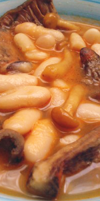 Ingredientes: 180 grs de alubias secas, 150 grs. netos de carne magra de cerdo, 120 grs. de setas o champiñones, 75 grs. de tomate, 100 grs. de cebolla de guisar, 4 dientes de ajo y 1 cucharada mediana de aceite de oliva.