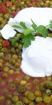 Ingredientes: Guisantes cocidos 400 gr., cebolla de guisar 150 gr., jamón serrano magro 70 gr., huevos de gallina grandes (2 Uds.), 6 dientes de ajo, 60 gr. de pan integral, una copita de vino blanco, sal y especias al gusto.