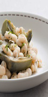 Preparación: Lavar las alubias y ponerlas en una ensaladera junto con las alcachofas cortadas en cuatro partes. Añadir sal. En una sartén, dorar el ajo con un poco de aceite, echar el vino y dejar que dé un hervor para que se evapore el alcohol; añadir las almejas, el limón y mantener al fuego hasta que se abran; retirarlas, reservar el caldo y quitar las conchas. Mezclar el caldo, el aceite restante, el vinagre, pimienta y sal. Batir bien y echar sobre las alubias. Adornar con el perejil picadito y servir.