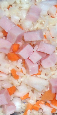 Ingredientes: 180 grs. de arroz, 400 grs. netos de carne de pavo (muslo o pechuga), 70 grs. de maiz cocido, 90 grs. netos de cebolla fresca. 60 grs. de pepinillos, 100 grs. netos de pimento morrón, 60 grs. de jamón serrano magro, 1 cucharilla de mostaza, 1 cucharada de aceite de oliva, vinagre y sal.